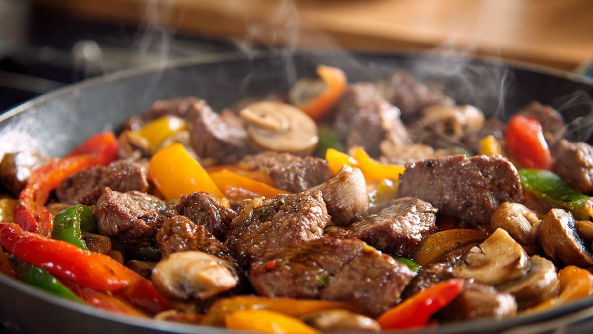 이제 가장 중요한 ‘볶는’ 과정이다. 팬에 올리브오일을 두르고 편으로 썬 마늘을 볶아 향을 내다가, 버터를 넣어 고소한 풍미를 더한다. 버터가 녹아 향긋한 냄새가 올라오면, 재워둔 소고기와 채소를 모두 넣고 ‘센 불’에서 빠르게 볶아낸다.