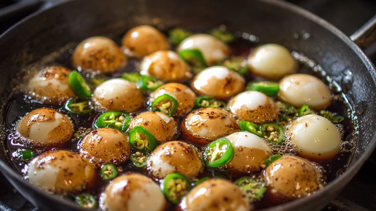 여기에 마늘, 생강, 다시마 등을 함께 넣고 끓이면 감칠맛이 더해져 간장의 사용량을 줄일 수 있다. 양념장이 끓기 시작하면 삶은 메추리알을 넣고 중약불에서 10~15분가량 서서히 조린다.
